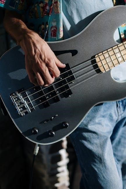Power chords are essential for bass guitarists, particularly in rock, punk, and metal music. They consist of a root note and a perfect fifth, creating a strong, driving sound. These chords are versatile and often used in riffs and bass lines. On the bass guitar, power chords are typically played on the lower strings for maximum impact. PDF guides frequently include power chord diagrams, showing finger placements and fret positions. They are simple to learn but powerful in application, making them a cornerstone of many bassists’ arsenals. Mastering power chords enhances your ability to play dynamically and with authority, making them a must-learn for any serious bass player.
